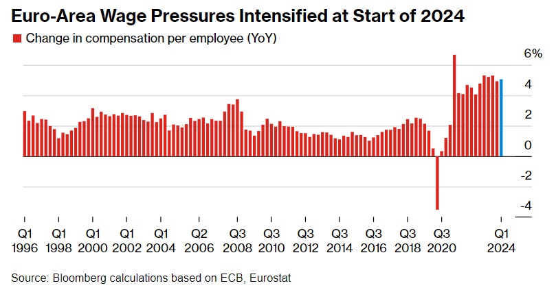 智通财经APP获悉,欧洲央行首选的薪酬衡量标准——欧元区人均薪酬指标在2024年初出现意外加速上涨的趋势,这是该地区物价压力持续存在的最新迹象,为欧洲央行的降息路径蒙上阴霾,加之欧洲央行的官员们纷纷承诺对进一步降息持谨慎态度,市场难以预测下一次降息的时间点。欧洲央行周五公布的数据显示,欧元区第一季度员工人均薪酬较上年同期增长5.1%,高于去年第四季度修正后的4.9%,同时也高于经济学家们预期的4.6%。