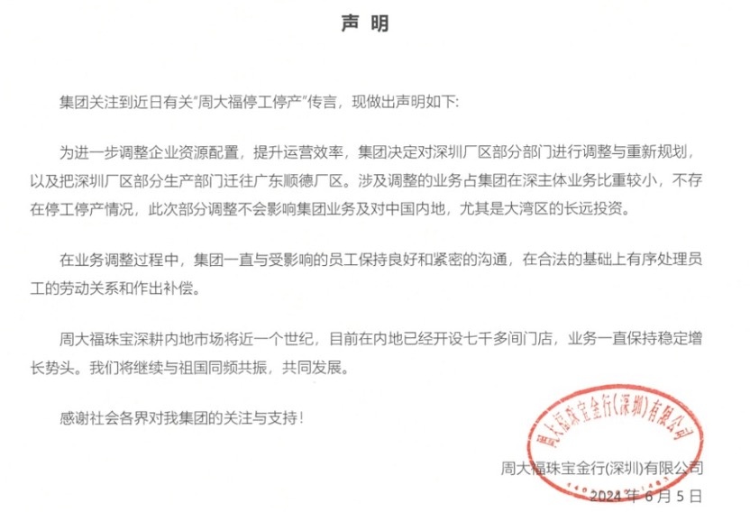 对此,周大福公开回应称,为进一步调整企业资源配置,提升运营效率,集团决定对深圳厂区部分部门进行调整与重新规划,以及把深圳厂区部分生产部门迁往广东顺德厂区。涉及调整的业务占集团在深主体业务比重较小,不存在停工停产情况,并强调此次部分调整不会影响集团业务及对中国内地,尤其是大湾区的长远投资。