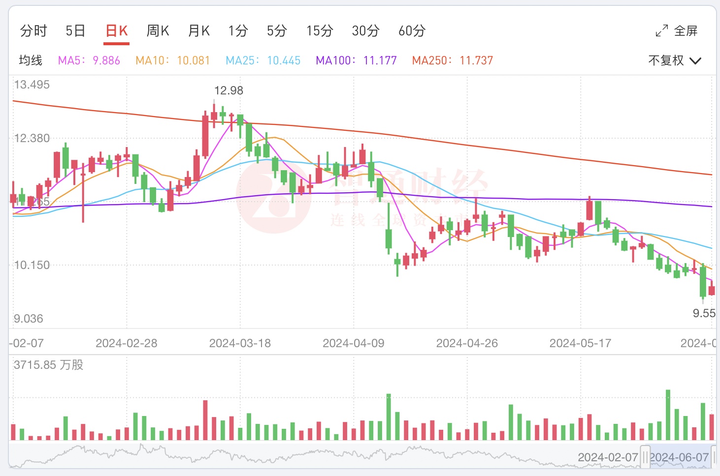 公告发出次日(即6月6日),公司股价高开低走,一度跌至9.55港元,创下三年以来的新低水平。值得注意的是,自3月中旬公司股价创下12.98港元的年内高位后,便反复下行,不到三个月公司股价已跌去近30%,公司市值已不足千万。