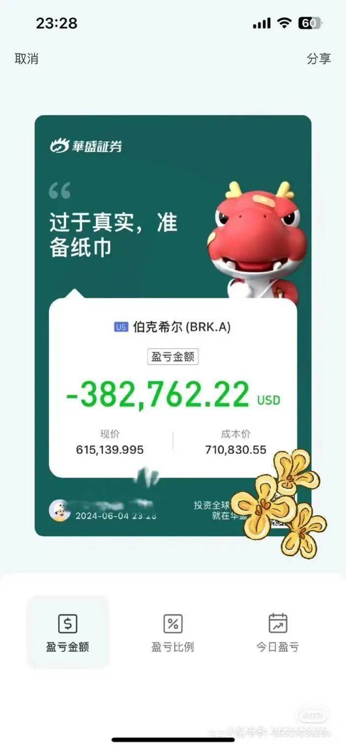据他所述,2024年6月3日晚10:00,他账户的实时总金额为1300多美元,但在华盛证券成功买入了一共4股伯克希尔-A,买入均价为710830.55美元/股,总金额为2846225.04美元,之后,数分钟后账面亏损近34万美元。