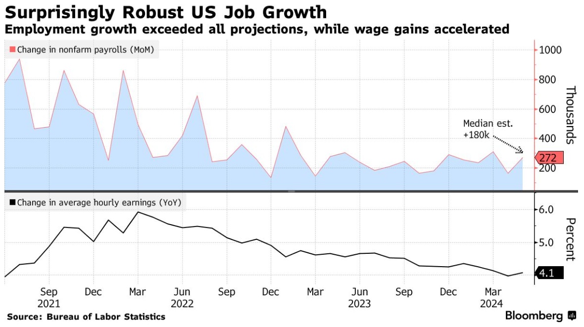 截至今年4月,美联储首选的通胀指标为2.7%,而美联储的目标是2%。上周五公布的数据显示,上个月就业人数激增,工资增长加快,这促使交易员降低了对今年降息的预期。