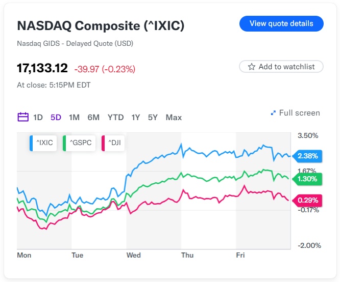 纳斯达克综合指数上涨约2.3%,标普500指数上涨约1.3%,道琼斯工业平均指数上涨约0.3%。