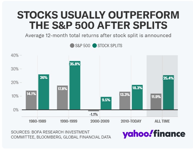 根据美国银行的分析,在宣布拆股后的12个月内,股票平均上涨25%,而同期标普500指数的平均回报率为12%。美国银行投资和ETF策略师Jared Woodard在给客户的一份报告中写道,“在所有市场机制中”都是如此。