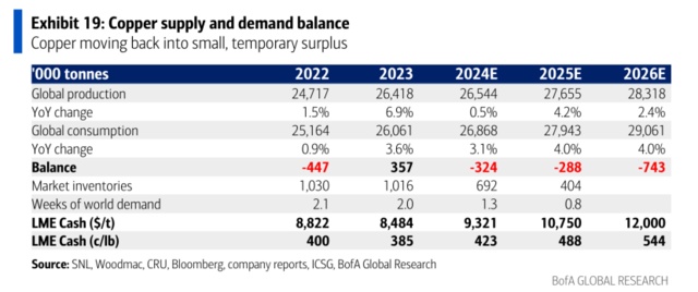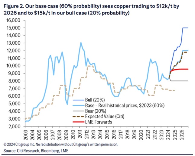 该行上调了短中期的铜价预测,预计铜价在短期内(0-3个月内)上涨至每吨9700美元,并在2024年第四季度达到每吨10000美元。到2026年,花旗预计,铜价有望在基准情景下涨至每吨12000美元,在乐观情景下涨至每吨15000美元。