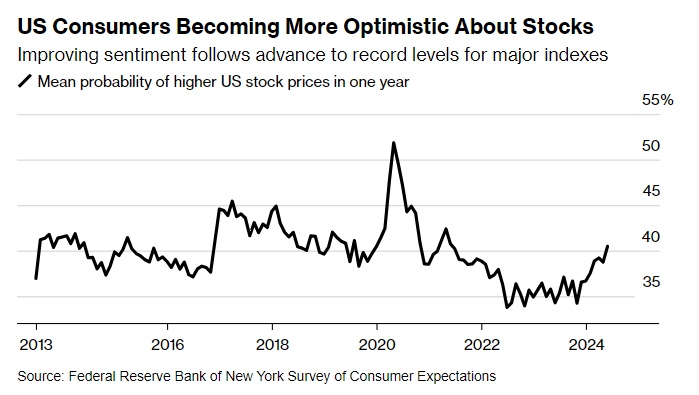 纽约联储周一公布的月度消费者调查结果显示,上个月,股市在一年后上涨的可能性达到40.5%,这是自2021年5月以来的最高水平。在大多数年龄组、教育水平和地区,乐观情绪普遍上升。