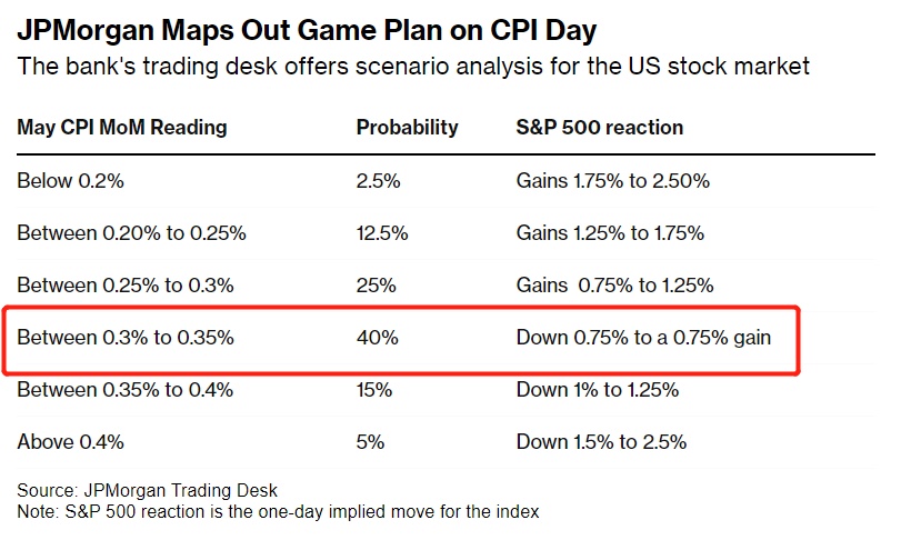 在摩根大通交易团队看来,标普500指数最乐观的涨幅区间预期为1.75% 到2.50%,但这是概率最低的情况,仅仅为2.5%,所要求的核心CPI环比涨幅仅仅为0.2%;标普500指数最悲观的跌幅区间预期为下跌1.5%到2.5%,这是概率第二低的情况,仅为5%,所要求的核心CPI环比涨幅超过4%。