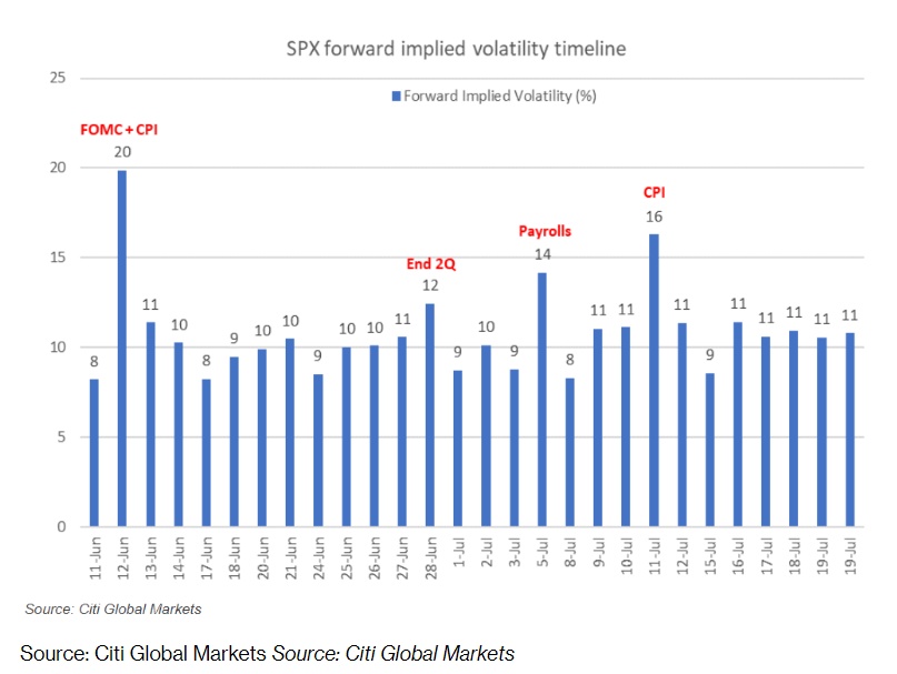 智通财经APP获悉,从摩根大通(JPMorgan)到花旗集团(Citigroup Inc.),华尔街最知名的商业银行旗下交易业务部门都在敦促投资者们为本周美国股市剧烈震荡做好准备工作,在投资者们经历相对平淡的近几个股票市场交易日之后,市场巨大波动幅度即将在本周呈现。美东时间本周三将公布最新的美国CPI通胀数据以及美联储最新利率决议。摩根大通交易业务部门列出了通胀数据出炉后,美股可能出现的波动情况;花旗交易部门预计CPI和美联储利率决议带来的隐含波动率将剧烈上升。