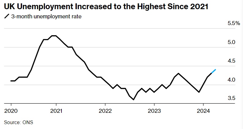 智通财经APP获悉,英国失业率意外升至逾两年半以来的最高水平,而私营部门的加薪压力有所缓解,进一步表明通胀压力正在减弱。英国国家统计局周二公布,在截至4月份的三个月里,失业率升至4.4%,为2021年年中以来的最高水平。私营部门的平均周薪增长了5.8%,是两年来的最低水平。