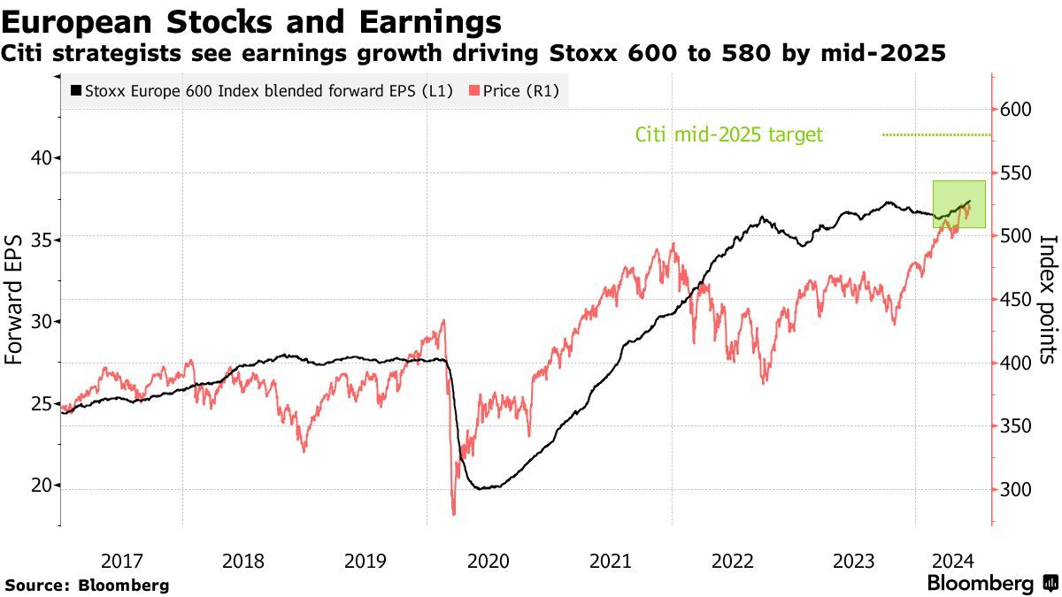 花旗策略师预计,在经历了今年的强劲上涨之后,泛欧斯托克600指数还将上涨11%,至580点。策略师表示,欧洲企业盈利势头良好,宏观经济环境有利,且欧洲央行在上周首次降息,这些因素仍然令他们感到鼓舞。