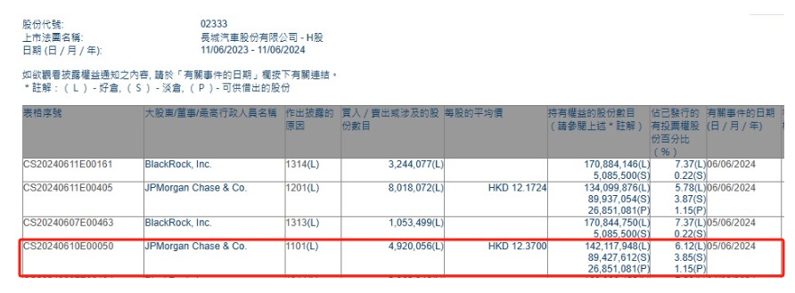 智通财经APP获悉,香港联交所最新资料显示,6月5日,摩根大通增持长城汽车(02333)492.0056万股,每股作价12.37港元,总金额约为6086.11万港元。增持后最新持股数目约为1.42亿股,持股比例为6.12%。