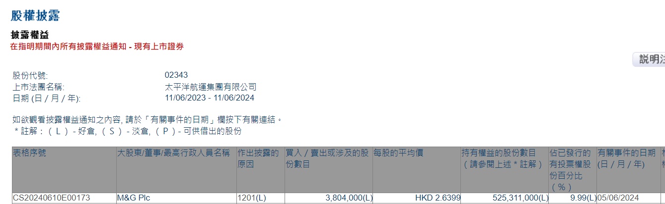 Plc减持太平洋航运(02343)380.4万股,每股作价2.6399港元,总金额约1004.22万港元。减持后最新持股数目约5.25亿股,最新持股比例为9.99%。