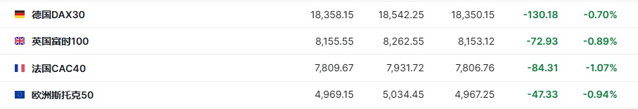 2. 截至发稿,德国DAX指数跌0.70%,英国富时100指数跌0.89%,法国CAC40指数跌1.07%,欧洲斯托克50指数跌0.94%。
