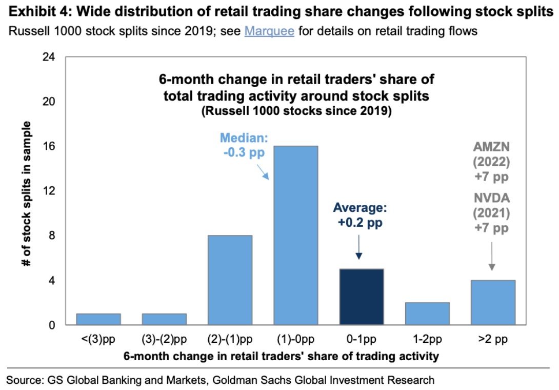 高盛汇编的历史数据显示,自2019年以来完成股票分拆的46家罗素1000指数成分股公司的回报率比标普500指数高出4个百分点。