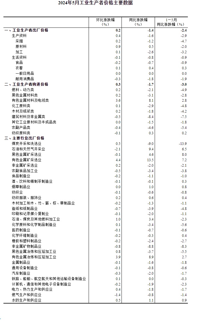 2024年5月份,全国工业生产者出厂价格同比下降1.4%,降幅比上月收窄1.1个百分点,环比上涨0.2%,上月为下降0.2%;工业生产者购进价格同比下降1.7%,环比上涨0.3%。1—5月平均,工业生产者出厂价格比上年同期下降2.4%,工业生产者购进价格下降3.0%。