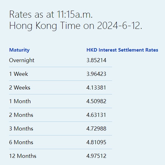 智通财经APP获悉,6月12日,港元拆息普遍回升,其中,隔夜拆息轻微反弹5基点至3.85214%,一周拆息亦从逾三周低位回升至3.96423%,但与楼按相关的一个月拆息则维持4.50982%。