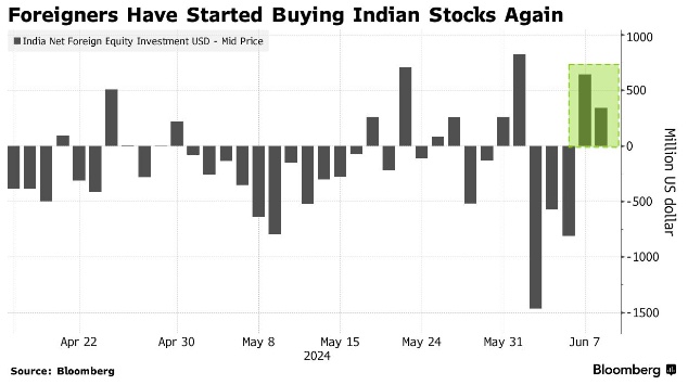 根据数据,海外投资者在上周五和本周一共购买了价值9.855亿美元的印度股票。这帮助印度股指收复了与选举相关的下跌,并在本周早些时候创下历史新高。他们的回报表明,他们可能对印度近5万亿美元股市的估值感到满意。