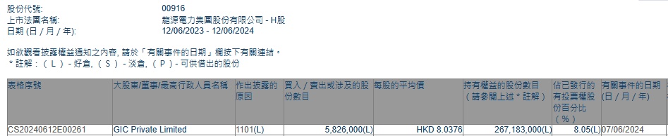 智通财经APP获悉,香港联交所最新资料显示,6月7日,新加坡政府投资公司增持龙源电力(00916)582.6万股,平均每股作价8.0376港元,总金额约4682.71万港元。增持后最新持股数目约为2.67亿股,持股比例为8.05%。