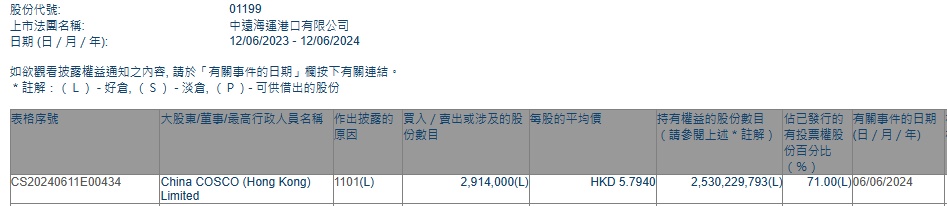 智通财经APP获悉,香港联交所最新资料显示,6月6日,China COSCO(Hong kong)Limited增持中远海运港口(01199)291.4万股,每股作价5.794港元,总金额约为1688.37万港元。减持后最新持股数目约为25.30亿股,最新持股比例为71.00%。