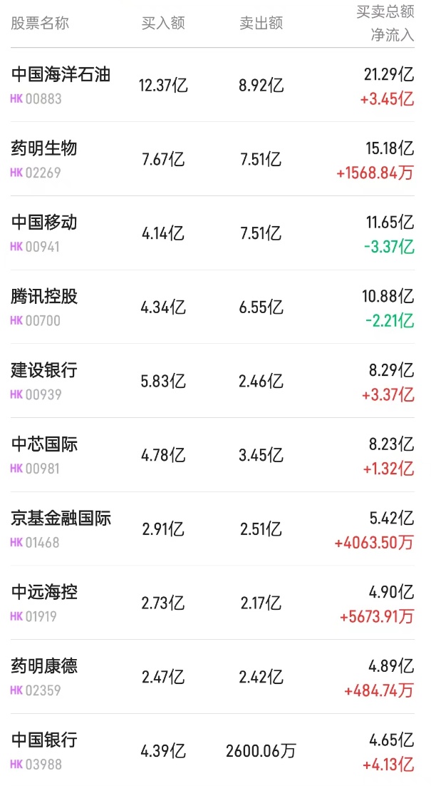 中海油(00883)获净买入3.4亿港元。消息面上,EIA月报上调2024年全球石油产品需求增量18万桶/日至110万桶/日,至1.03亿桶/日,较此前预测的1.028亿桶/日进一步提高。EIA还预计,明年全球石油需求可能升至1.045亿桶/日,较此前预估的1.043亿桶/日进一步上调。光大证券指出,“三桶油”在油价波动期体现出较强的业绩韧性,盈利中枢有望进一步上行,长期投资价值凸显。