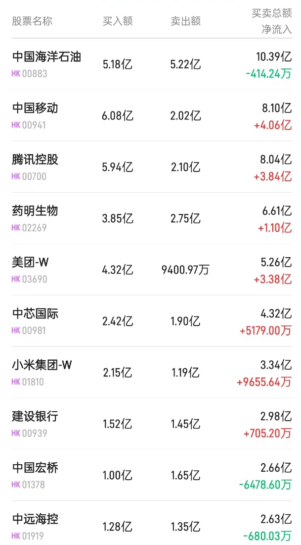 此外,小米集团-W(01810)、中国移动(00941)、京基金融国际(01468)分别获净买入9655万、6982万、4063万港元。