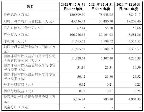 财务方面,于2020年度、2021年度和2022年度,斯贝科技实现营业收入分别为约4.86亿元、8.92亿元、10.67亿元人民币;同期,该公司实现净利润分别为6323.52万元、5189.52万元、约1.16亿元人民币。