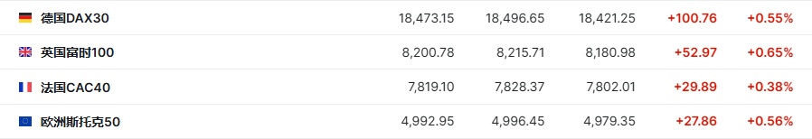 2. 截至发稿,德国DAX指数涨0.55%,英国富时100指数涨0.65%,法国CAC40指数涨0.38%,欧洲斯托克50指数涨0.56%。