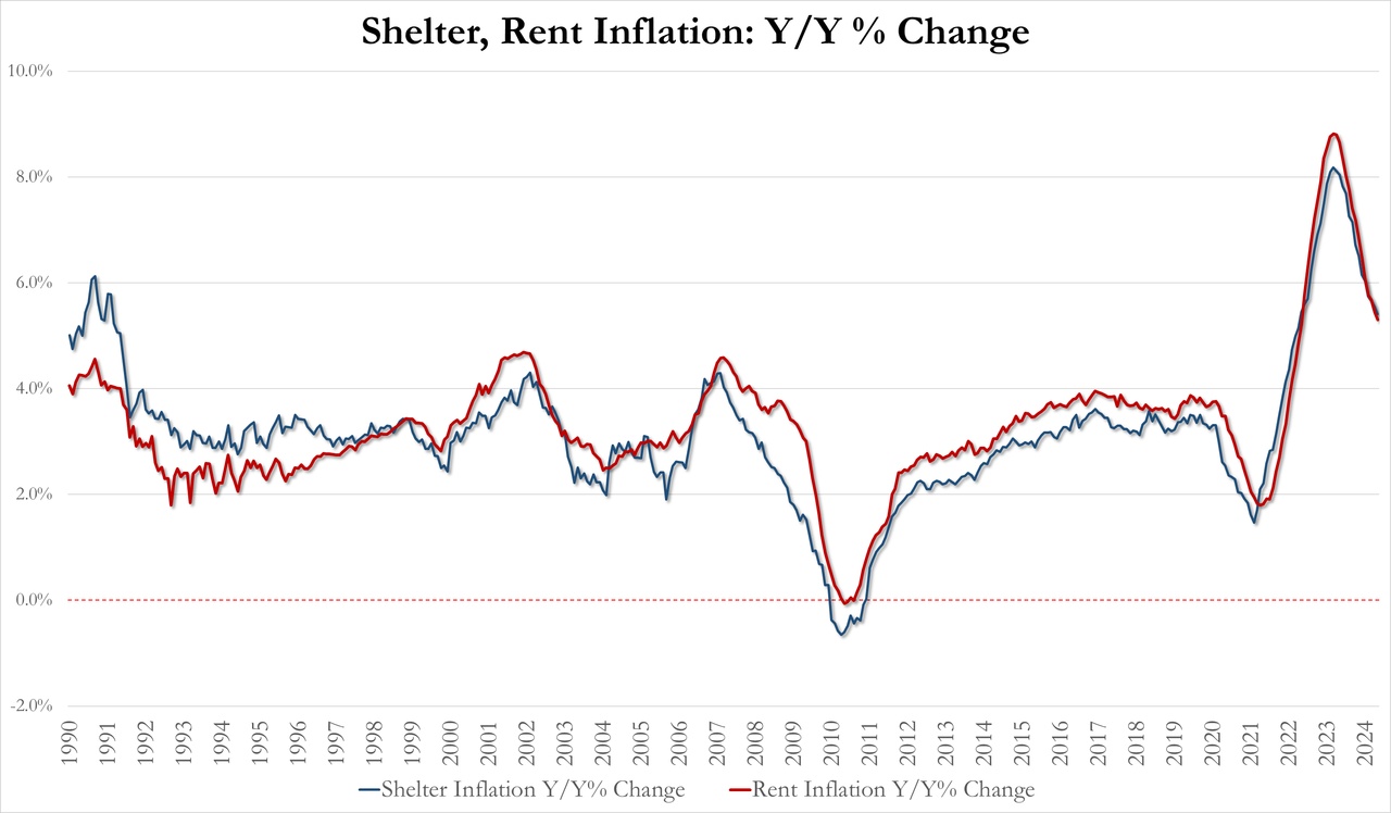 尽管所有项目和核心指标的总体通胀数据都有所下降,但住房通胀环比上涨0.4%,同比上涨5.4%,是当月除食品和能源外所有项目指数上升的最大因素。美国劳工统计局的数据显示,住房价格上涨抵消了汽油价格下跌的影响。住房价格是服务通胀中最大的类别。业主等效租金——住房的一个子集,是CPI中最大的单个组成部分——也以类似的速度上涨。5月租金同比上涨5.30%,低于5.44%,是2022年5月以来的最低水平。