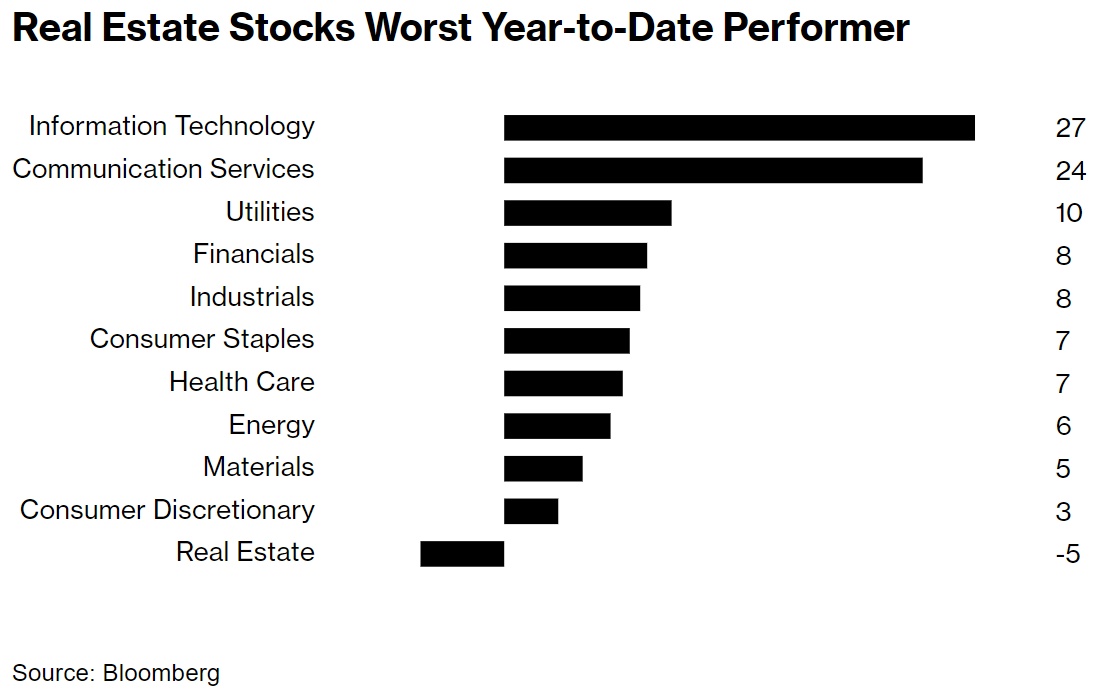 这一走势反映出房地产行业对利率的高度敏感性,特别是对于那些将借来的钱投入到办公室、购物中心、医疗设施和手机信号塔等其他项目的高杠杆公司而言。