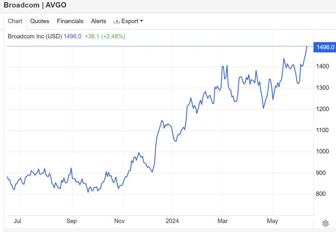 此外,总部位于加州帕洛阿尔托的博通还宣布了一项“1拆10”的股票分拆计划,预计将于7月15日生效。博通跟随英伟达迈出了“拆股”这一重压步伐,英伟达拆股已经于6月7日生效。