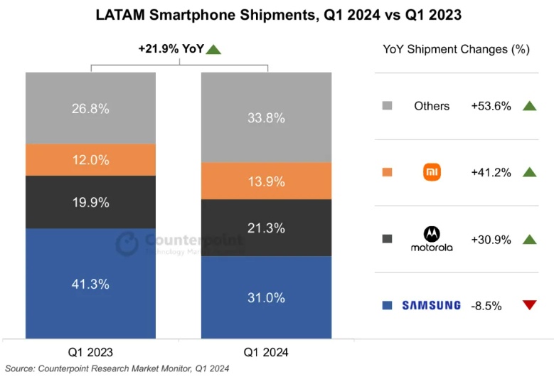 智通财经APP获悉,Counterpoint Research发文称,拉丁美洲第一季度智能手机出货量同比增长 21.9%,环比增长 12%,达到自 2021 年第四季度以来的最高水平。三星仍以 31% 的份额保持市场领导地位,但其出货量同比下降了 8.5%。摩托罗拉出货量为自 2021 年第四季度以来的最高水平,稳居第二,市场份额为 21%。小米(01810)排名第三,其出货量同比增长 41.2%。