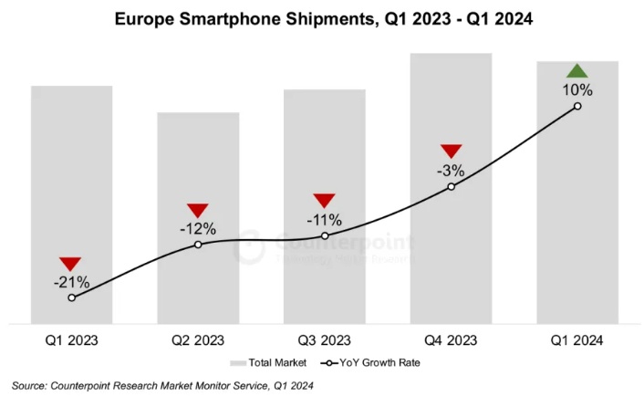 2024 年第一季度,欧洲智能手机出货量同比增长 10%,终于结束了自 2021 年第三季度以来的连续同比下降趋势。