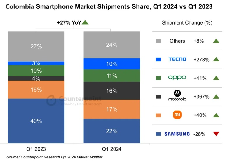 哥伦比亚 2024 年第一季度智能手机出货量同比增长 27%,为 2022 年第二季度以来最高