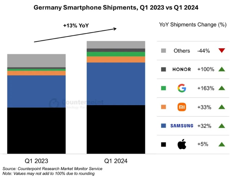 德国 2024 年第一季度智能手机出货量同比增长 13%,结束了连续八个季度的同比下滑趋势。