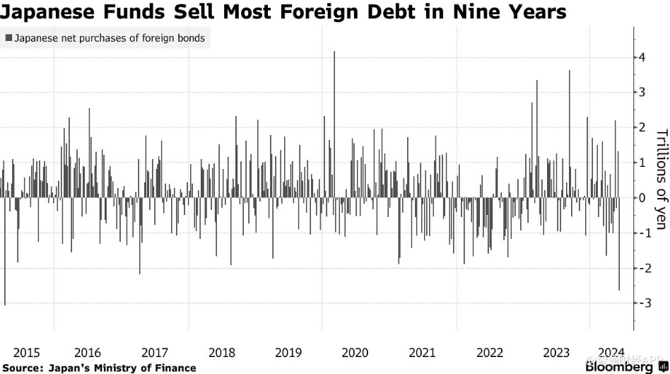 智通财经APP获悉,在全球央行政策发生转变之际,日本投资者抛售了9年来规模最大的海外债券。日本财务省周四公布的初步数据显示,截至6月7日的一周,净销售额总计2.65万亿日元(合169亿美元),为2015年4月以来的最高水平。5月则买入2.3万亿日元。上周,欧洲央行和加拿大央行双双降息,美国制造业和职位空缺数据疲弱。