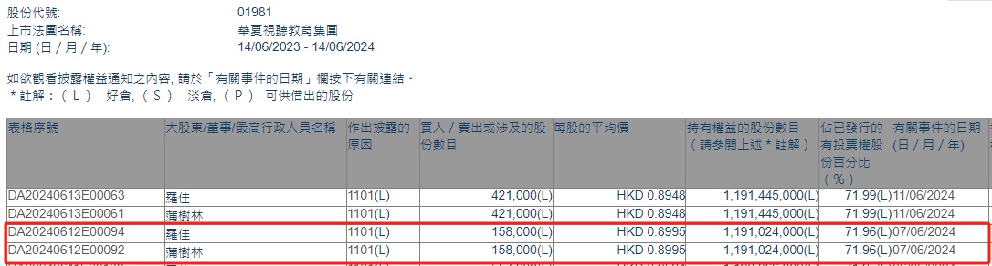 智通财经APP获悉,香港联交所最新资料显示,6月7日,蒲树林增持华夏视听教育(01981)15.8万股,每股作价0.8995港元,总金额约为14.2121万港元。增持后最新持股数目约为11.91亿股,最新持股比例为71.96%。