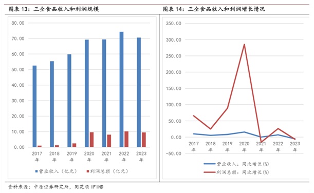 三全食品的收入规模从 2004 年的 5.8 亿元增长至 2023 年的 70.56 亿元;利润规模从 2017年的 0.1 亿元增长至 2023 年的 9.58 亿元,作为样板级企业,见证了预制米面产业的全部发展历程。公司的销售净利率从 2004 年的 1.74%上升至 2024 年的 10.19%,通过提升产品附加值以及节约经营成本,将低盈利的农产品加工产业经营为具有品牌溢价以及高附加值的消费赛道。