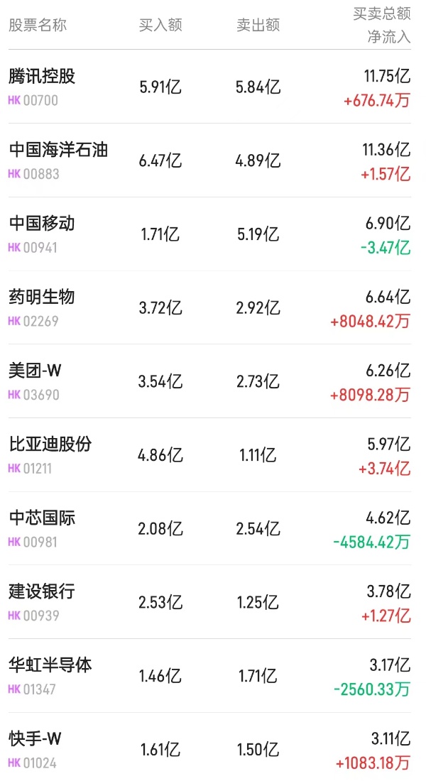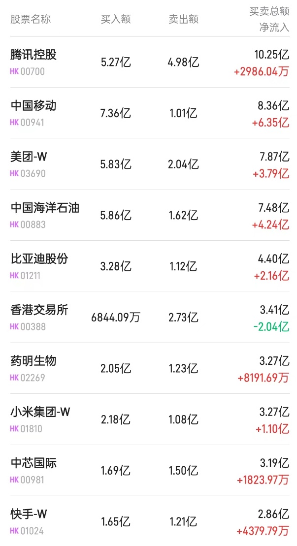 中海油(00883)获净买入5.81亿港元。消息面上,EIA月报上调2024年全球石油产品需求增量18万桶/日至110万桶/日,至1.03亿桶/日,较此前预测的1.028亿桶/日进一步提高。EIA还预计,明年全球石油需求可能升至1.045亿桶/日,较此前预估的1.043亿桶/日进一步上调。光大证券指出,“三桶油”在油价波动期体现出较强的业绩韧性,盈利中枢有望进一步上行,长期投资价值凸显。