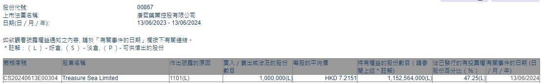 智通财经APP获悉,香港联交所最新资料显示,6月13日,Treasure Sea Limited增持康哲药业(00867)100万股,每股作价7.2151港元,总金额为721.51万港元。增持后最新持股数目约为11.53亿股,最新持股比例为47.25%。
