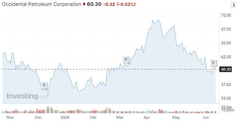 伯克希尔在西方石油公司的头寸目前价值超过150亿美元,占其总投资组合的4.6%,但巴菲特表示,他无意买下整个公司。巴菲特可能是在利用西方石油公司近期股价下跌的机会。该公司股价已接近三个月低点,周三收于60.30美元,远低于4月份71.19美元的盘中高点。