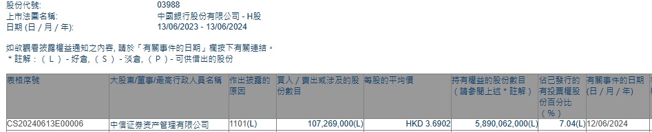 智通财经APP获悉,香港联交所最新资料显示,6月12日,中信证券资产管理有限公司增持中国银行(03988)1.07269亿股,每股作价3.6902港元,总金额约为3.96亿港元。增持后最新持股数目约为58.90亿股,最新持股比例为7.04%。