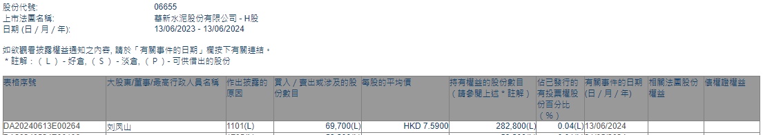 智通财经APP获悉,香港联交所最新资料显示,6月13日,公司董事刘凤山增持华新水泥(06655)6.97万股,每股作价为7.59港元,总金额约为52.90万港元。增持后最新持股数目为28.28万股,最新持股比例为0.04%。