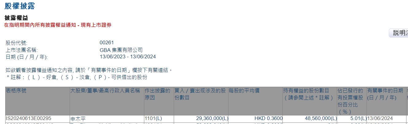 智通财经APP获悉,香港联交所最新资料显示,6月13日,申木平增持GBA集团(00261)2936万股,每股作价0.36港元,总金额为1056.96万港元。增持后最新持股数目约为4856万股,最新持股比例为5.01%。