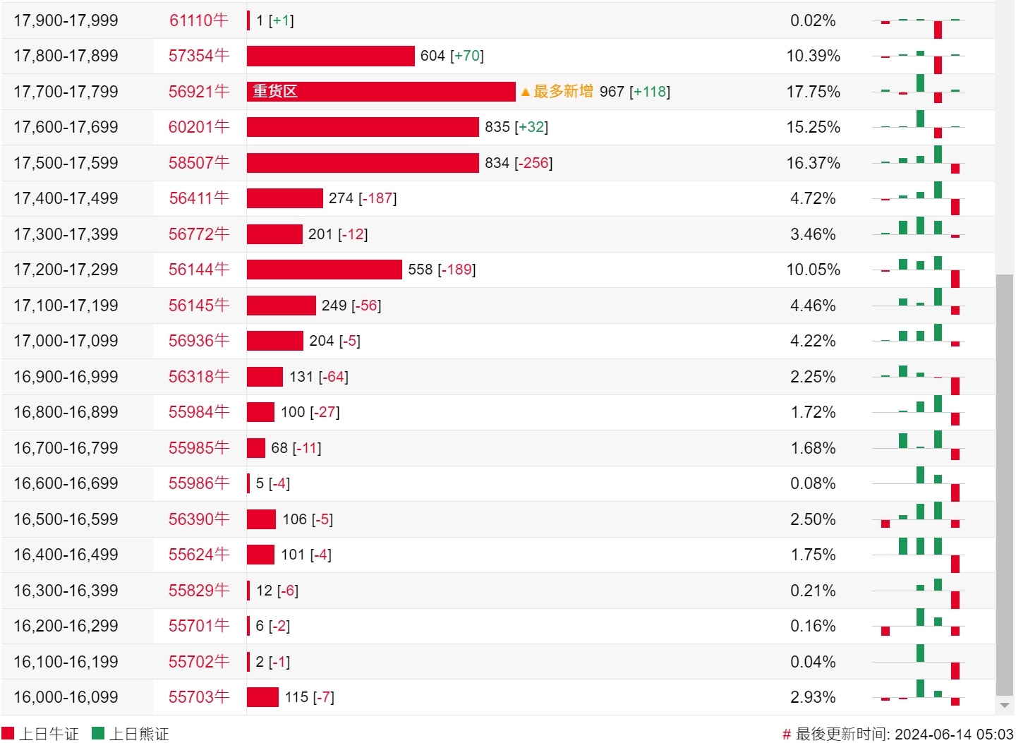 牛证街货重货区和最多新增都在17700-17799区间,该区间最新牛证数量为967张,较上一交易日增加118张。