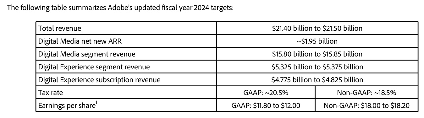 Adobe管理层还将2024财年的全财年non-GAAP调整后每股利润预期大幅上调至18.0美元至18.20美元,此前12月给出的预估区间则为17.6美元—18美元,超过分析师预期的18.02美元。全财年总计销售额预期则上调至214亿美元至215亿美元,较该公司去年12月给出的213亿美元至215亿美元的低端区间有所上调,最新销售额预期高于分析师预期的214.6亿美元。