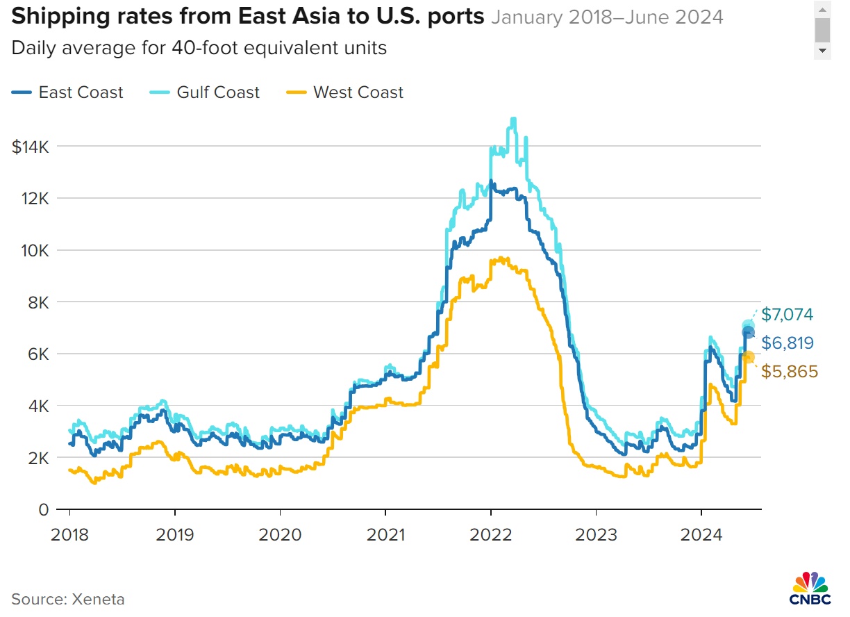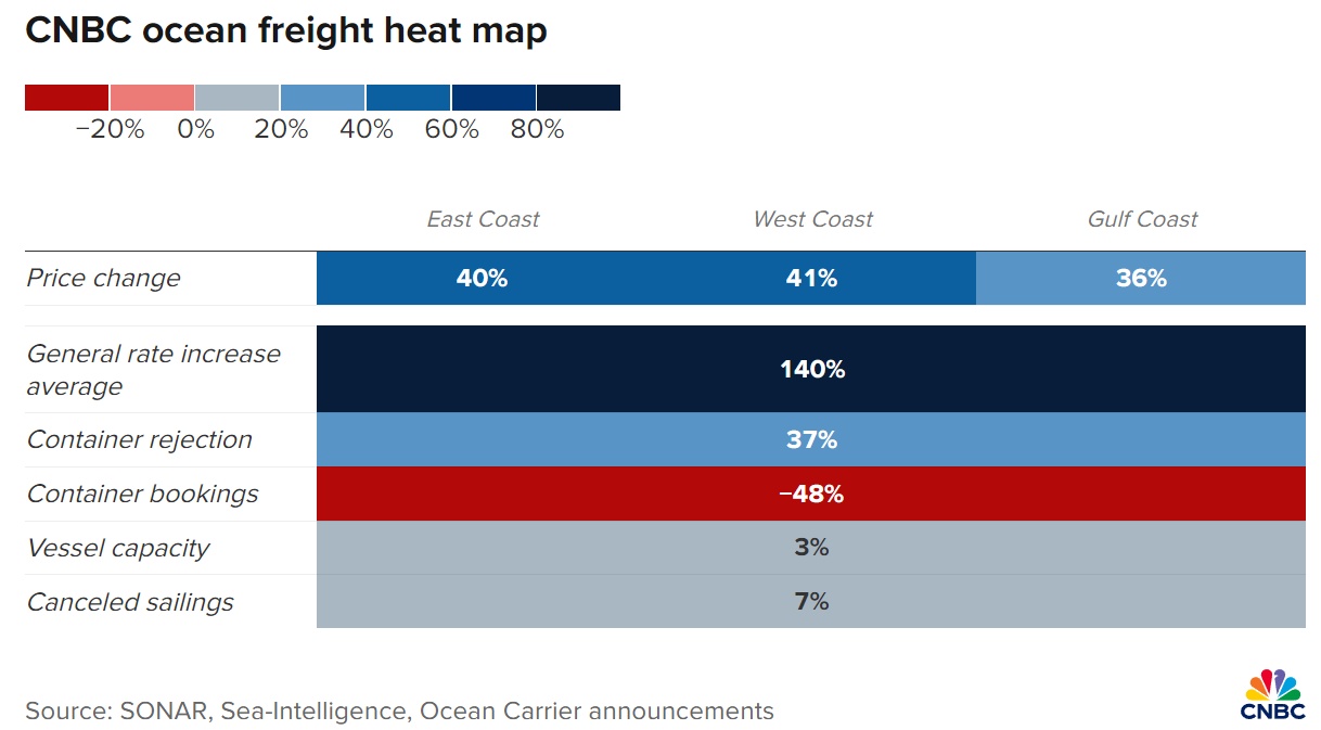 数据显示,从远东到美国的现货海运价格环比上涨 36%-41%,海运承运商将额外费用(即一般费率上涨)提高了约 140%。这些成本导致 40 英尺集装箱的价格上涨至约 12,000 美元。