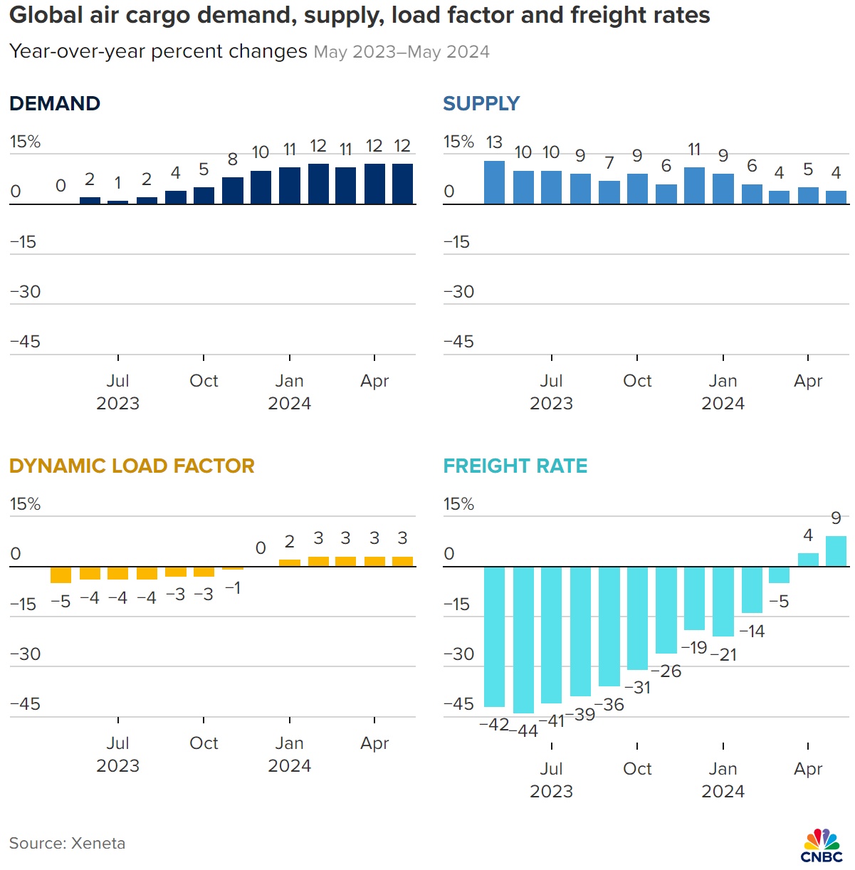 需求增加是航空货运市场的一个因素。在最近给客户的一份报告中,Xeneta写道,全球航空货运市场“在5月份需求同比增长12%之后,2024年的货运量有望实现两位数的增长。”