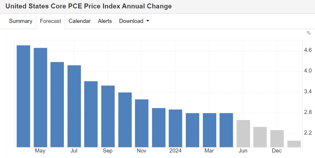 Trading Economics计量经济学模型的预测数据显示,根据全球宏观模型结合分析师普遍预期,预计本季度末美国核心 PCE 价格指数年度同比变化率将达到2.60%,12月核心PCE同比增幅则有望降低至2.3%,而不是美联储最新官方预测数据所显示的2.8%核心PCE增幅。