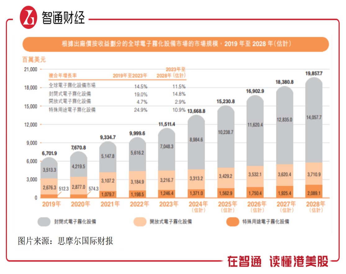 值得一提的是,即便各国监管趋严,但在产业链高利润下电子烟行业依然保持双位数的成长。根据沙利文数据,按全球电子雾化设备市场规模按出厂价格计算,2023年全球市场规模为115.11亿美元,2019-2023年市场规模复合增长率约为14.5%,并预计到2028年将达到198.6亿美元,复合增速11.5%。