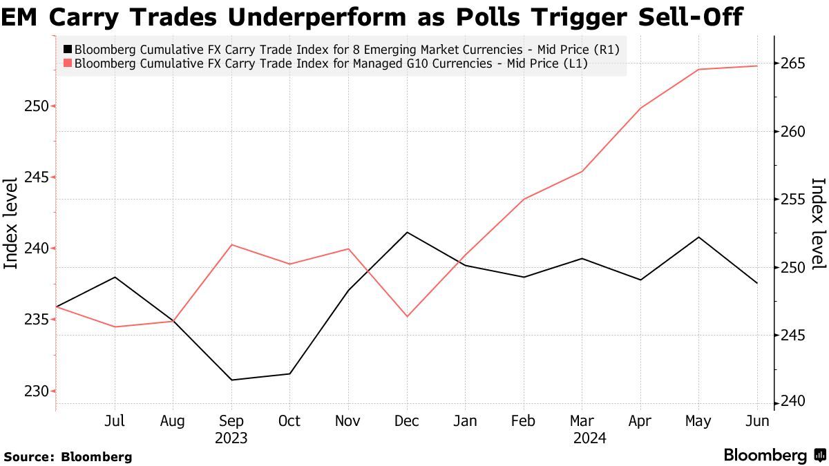 在墨西哥、印度的选举结果震惊了市场之后,波动性有所增加。本月早些时候,Claudia Sheinbaum在墨西哥大选中获胜后,墨西哥比索兑日元套利交易指数的回报率创下了疫情爆发以来的最大单周跌幅。