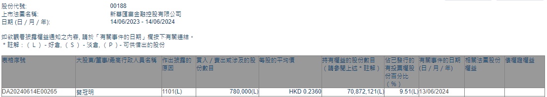 智通财经APP获悉,香港联交所最新资料显示,6月13日,行政总裁兼执行董事蔡冠明增持新华汇富金融(00188)78万股,每股作价0.236港元,总金额约为18.41万港元。增持后最新持股数目约为7087.21万股,最新持股比例为9.51%。